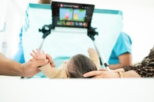 Während des Eingriffs werden bunte Zeichentrickfilme auf dem Tablet gezeigt, wodurch:
